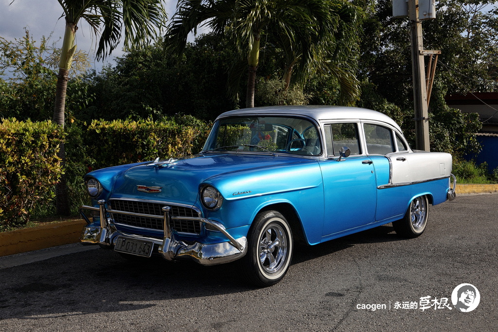 这辆1955年款的雪佛兰 Bel Air 是奥克维尔老爷爷车展上的常客,见《老爷爷开老爷爷车》。然而在加拿大,它已经被当作老爷爷供了起来,在这里还要像小伙子一样发光发热——这么光的漆面,一定是重新做过了,古巴虽然工业欠发达,但是相信不缺能工巧匠。