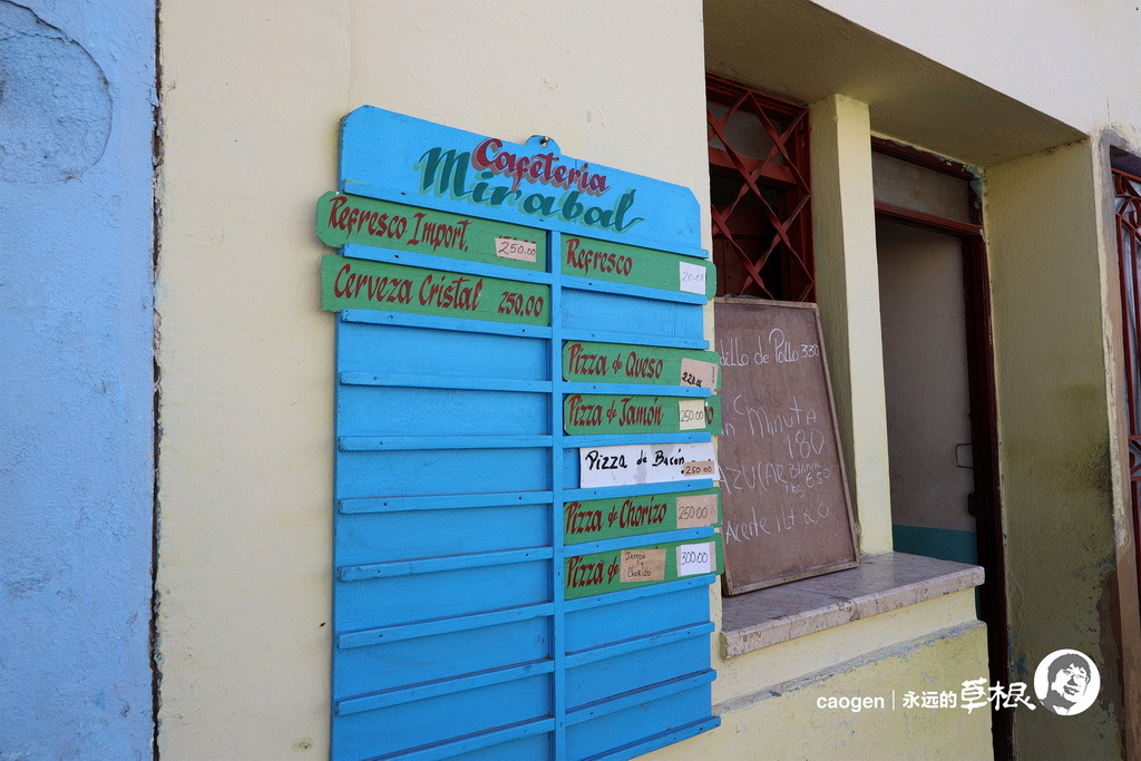 小店墙上的价目表,啤酒和比萨的价格大都是200-300比索,通常古巴人的月工资是5,000比索。