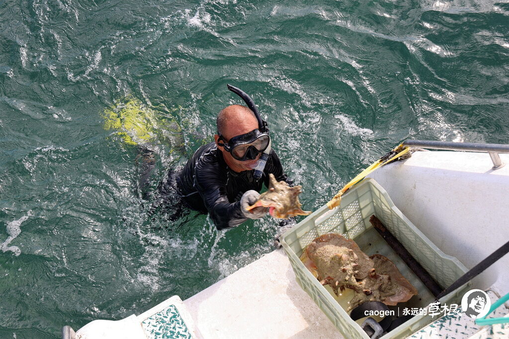 船在海中停了下来,船家下海先捞几只海螺上来,