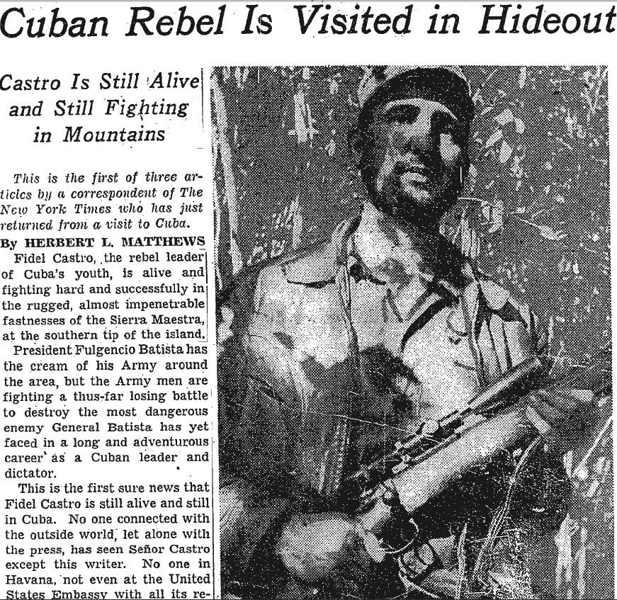 马修斯进入马埃斯特腊山采访了卡斯特罗,2月24日第一篇报道就登上了《纽约时报》的头版:“菲德尔·卡斯特罗,年轻的古巴反政府军领袖还活着,在马埃斯特腊山脉崎岖、几乎无法穿行的峻岭中顽强战斗,并且取得了成功……”